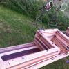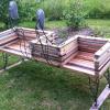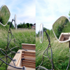 techniquement, un cadre métallique sert de support aux chutes de bois d'une menuiserie trouvée à côté. Ces chutes sont enfilées sur des tiges filetées. Les pieds et les bras articulés sont tressés avec de petites sections de rond pleins en acier.